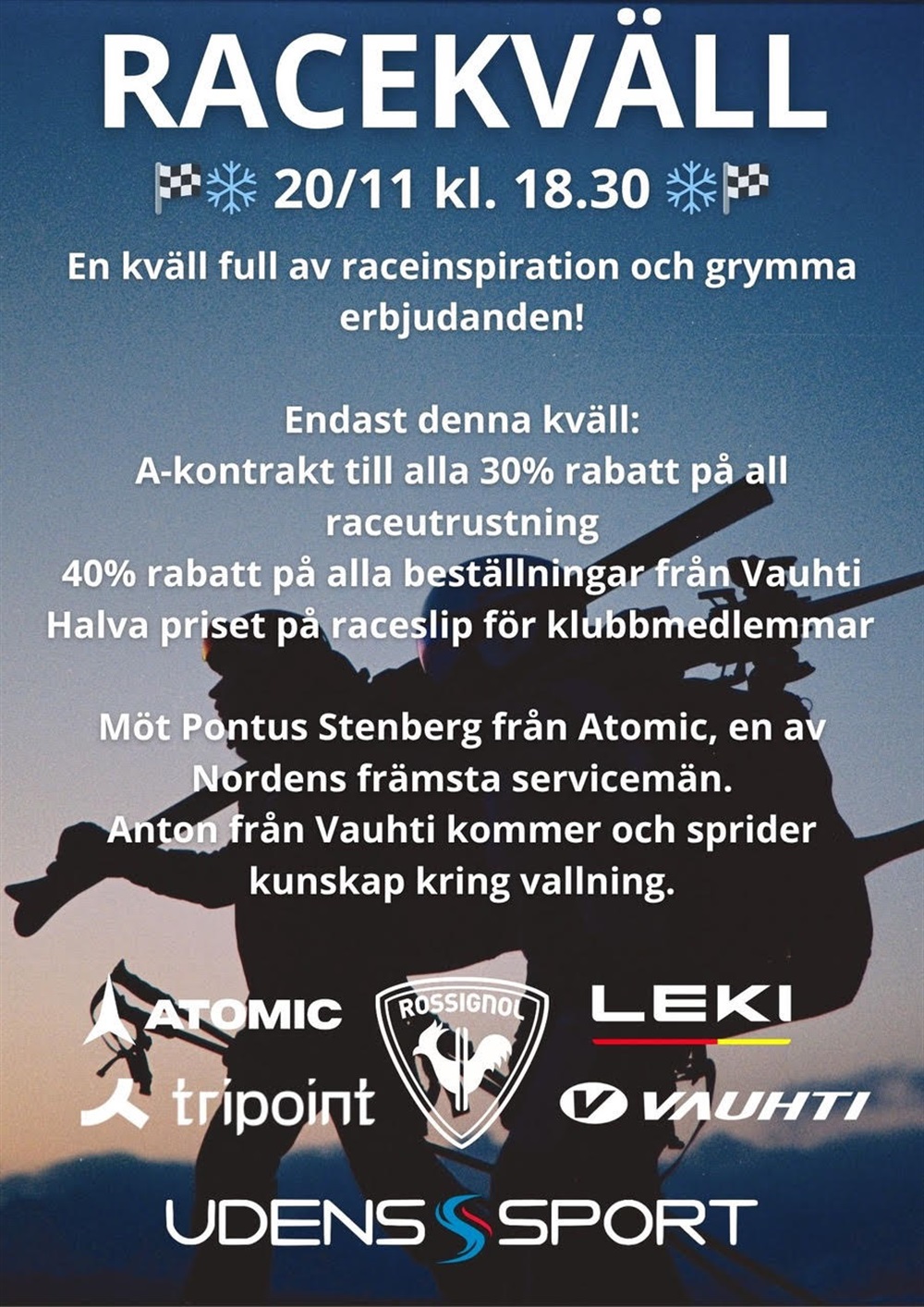 Som en del av detta vill vi kickstarta säsongen med en Racekväll i butiken torsdag 20 november kl. 18:30, där era klubbmedlemmar får ta del av unika erbjudanden och experthjälp från Atomic och Vauhti.